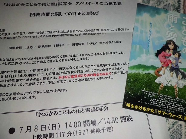 これが一通目にきた試写会の案内とお詫び状(笑)